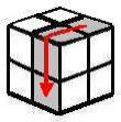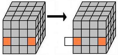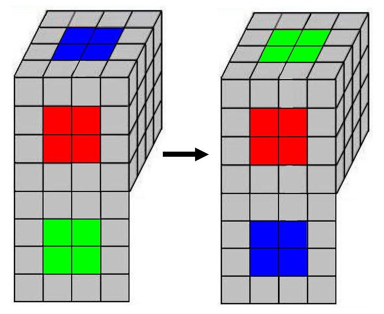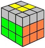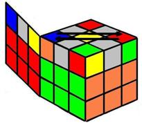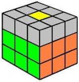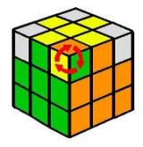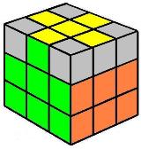 Debemos buscar dos cubitos del mismo color (en la capa amarilla) y traerlos a la izquiera. Si no hay dos cubitos juntos del mismo color (como en el ejemplo), no importa, realizamos los giros siguientes y ya tendremos dos cubitos del mismo color. ATENCIÓN: ahora ya se puede girar el cubo entero. |
