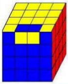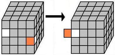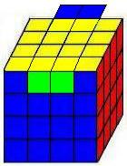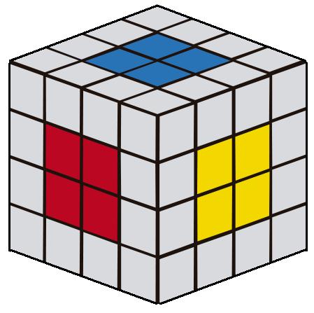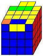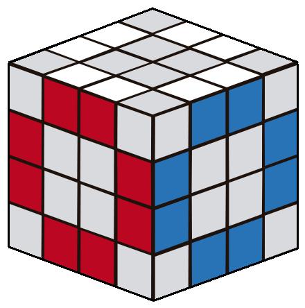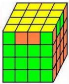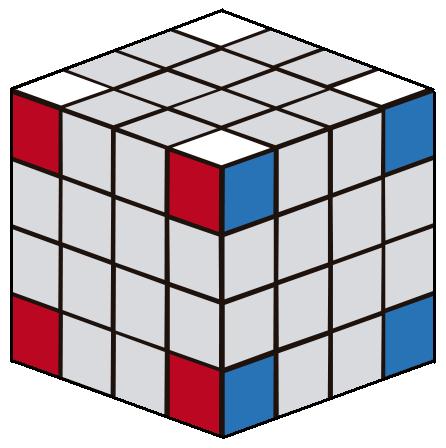 Igual que el cubo 3x3x3, el cubo 4x4x4 se compone también de centros, aristas y esquinas pero con algunas diferencias: cada centro está compuesto por 4 piezas y las aristas por 2 piezas, además los centros no se encuentran fijos por lo que hay que estar atentos a su posición correcta. Estando la cara blanca arriba y la amarilla abajo los centros siguen el orden naranja, verde, rojo y azul. Se hallan opuestos pues el blanco y amarillo, naranja y rojo y verde con azul. Las piezas de cubo son: |