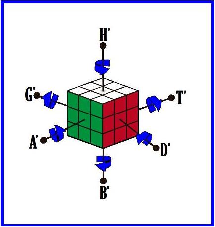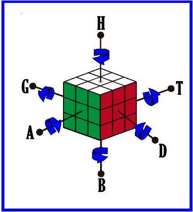 Giros: Una letra, A por ejemplo, significa girar la cara A 90º en el sentido de la agujas del reloj. A’ significa girar A 90º en sentido contrario; H2 significa girar 180º la cara H. |